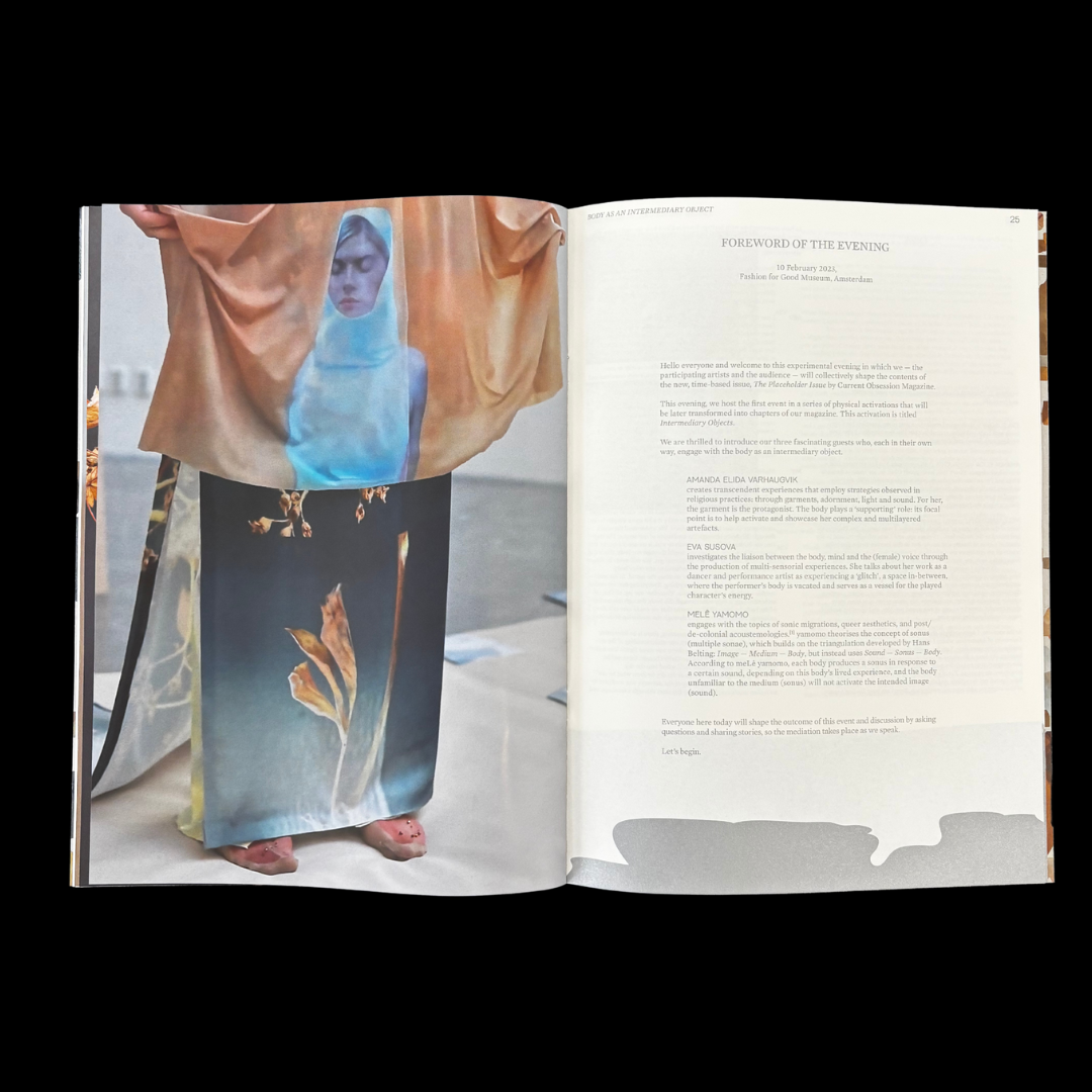 With this issue, Current Obsession introduces an experimental publishing model, with the magazine being released chapter by chapter throughout the year, instead of all at once. Each chapter comes a result of an in-real-life activation, in the case of this issue – an evening of performances and conversations, a workshop, a studio visits and panel discussion, and a museum archive visit. The final content is, therefore, not defined in advanced, but rather, created together with our public. We set out with a premise, an idea, and we ask others to join us in conversation, shaping the outcome together.
