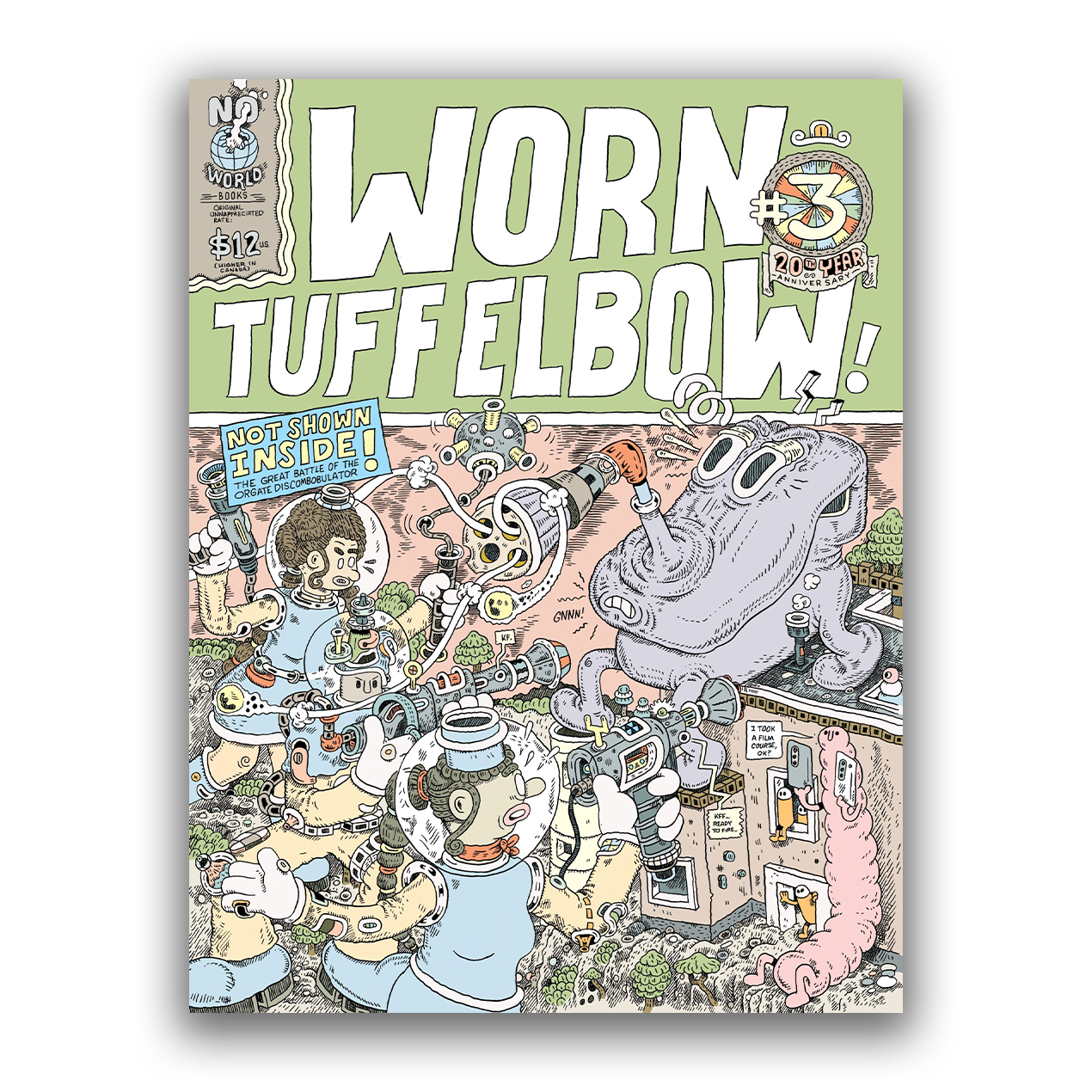 Marc Bell’s third issue of Worn Tuff Elbow marks the 20th anniversary of the series! Resembling a fever dream, this full colour comic book is accompanied by lots of fake ads and other odds and ends, and including Bell’s foray back into satirical autobiographical comics.